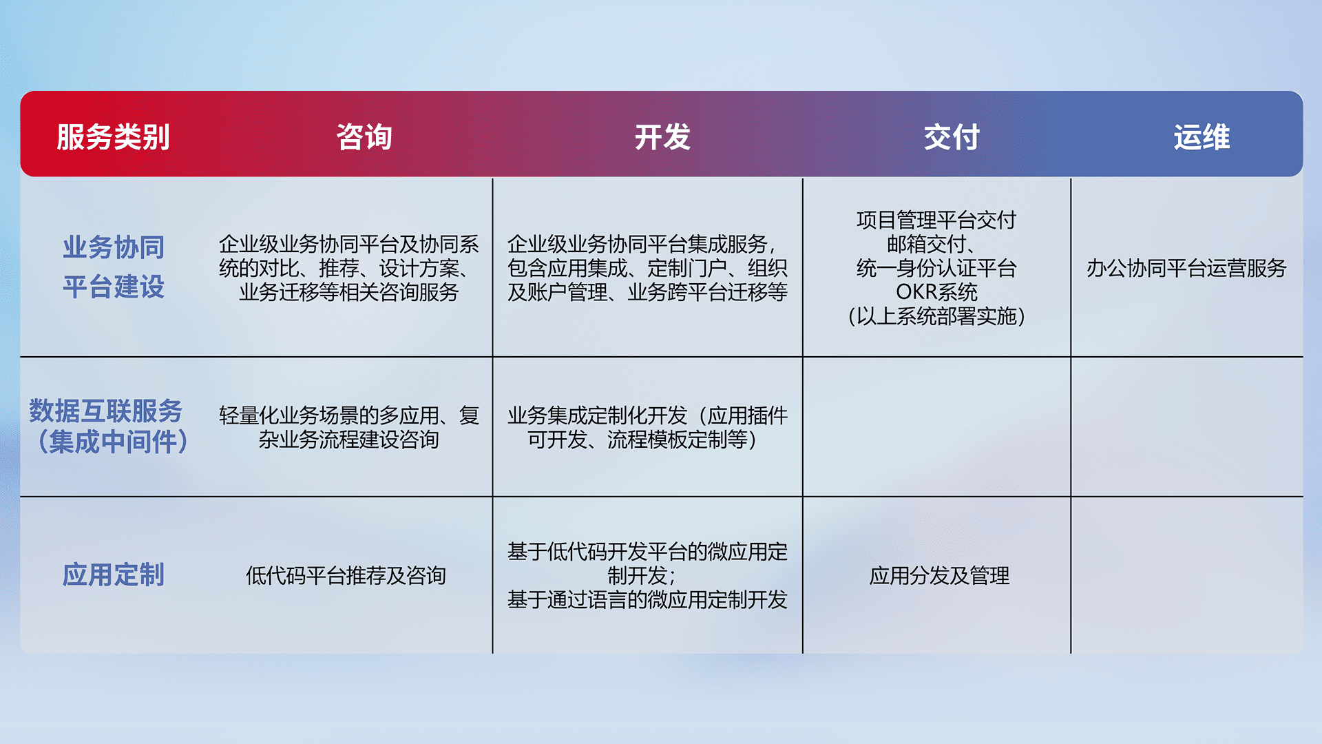 针对钉钉、、、、企微、、、、IDaas等平台级产品提供产品的规划、、、、方案、、、交付、、定制化开发等服务,,,,实现如统一协同办公、、智能客户服务、、、、混合会议管理、、智能数据查询、、等业务场景,,,实现数字化转型。。。