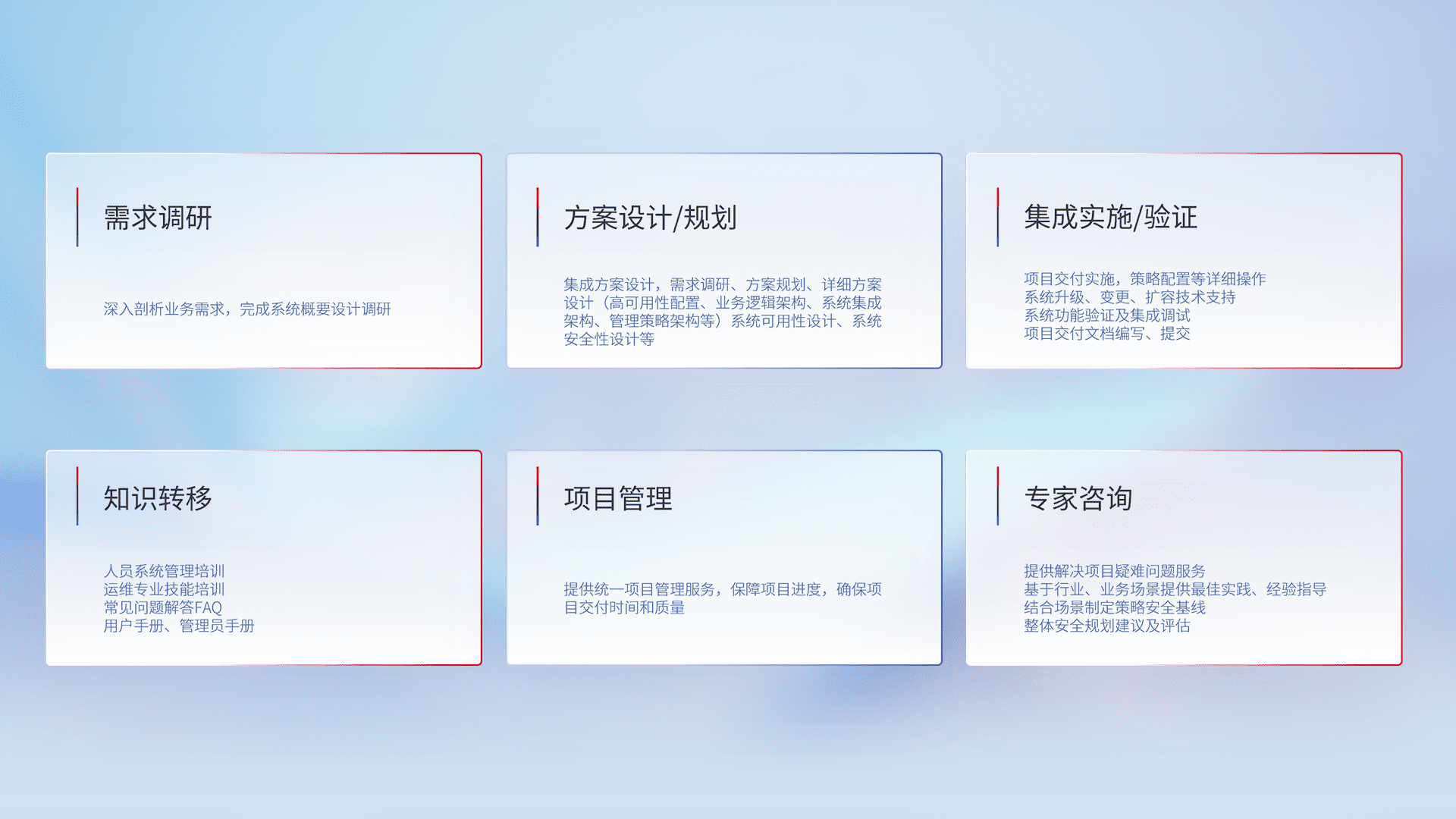 针对客户行业特性,,,将宏观的安全战略和需求,,通过专业的交付服务,,,实现项目落地,,,为客户提供标准规范的集成交付服务。。